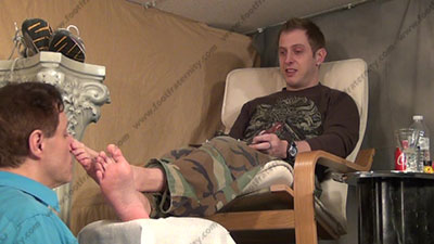 In military pants, sweaty sheer to toe dark dress socks, Riley is sitting above with his slave kneeling at his feet ready to be totally embarrassed & humiliated as he responds to Frat members comments about his foot worship sessions to his godly feet; he demonstrates how to humiliate foot slaves while his bitch is kissing the socked toes, smelling them; spitting loogies; worshiping the straight stud's socked feet as he talks; mocks; & commands his slave who is kneeling at the straight feet; first sock action, then licking sweaty bare toes and between them; three camera views (one close up) & two other very sensual angles. Hot erotic sock & bare foot action during this time as Riley's straight feet are served. His controlling ways of teasing foot sissys. He will dominate and humiliate foot slaves if you beg.