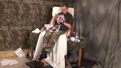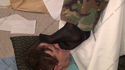 In military pants, sweaty think nylon socks, Riley is sitting above with his slave on the floor, beneath his feet ready to be totally embarrassed & humiliated as he relaxes and looks at Playboy mags while toying with his feet in the slave’s face; he shows how to force foot slaves to make love to his feet while his bitch is kissing the socked toes, smelling them, worshiping the straight stud's socked feet as he ignores him and reads or naps; mocks; first sock action, then licking sweaty bare toes and between them; three camera views (one close up) & two other very sensual angles. Hot erotic sock & bare foot action during this time as Riley's straight feet are served. He required that we make love to his feet!