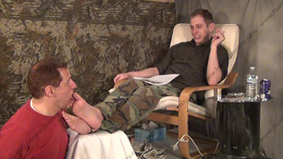In military pants, sweaty think nylon dress socks, Riley is sitting with his slave at his feet ready to be totally embarrassed & humiliated as he reads fan mail about his foot worship sessions and how to humiliate foot slaves. Then sissy has to kiss and sniff the dirty socked feet & toes, smelling them; worshiping the straight stud's socked feet as he talks; mocks; & commands his slave who is kneeling at the straight feet; three camera views (one close up) & two other very sensual angles. Hot erotic sock action during this film as Riley's straight feet are served. His controlling ways of teasing foot sissys humiliates them and Riley LOVES it!