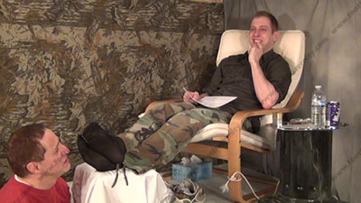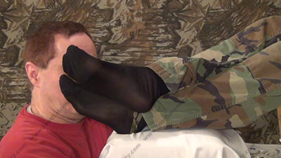 In military pants, sweaty think nylon dress socks, Riley is sitting with his slave at his feet ready to be totally embarrassed & humiliated as he reads more fan mail about his foot worship sessions and how to humiliate foot slaves. Then sissy has to kiss and sniff the dirty socked feet & toes, smelling them; worshiping the straight stud's socked feet as he talks; mocks; & commands his slave who is kneeling at the straight feet; three camera views (one close up) & two other very sensual angles. Hot erotic sock foot action during this time as Riley's straight feet are served. His controlling ways of teasing foot sissys humiliates them. He knows it.