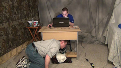 RILEY AT HIS DESK USING SLAVE'S CREDIT CARD ONLINE WHILE FEET ARE WORSHIPED