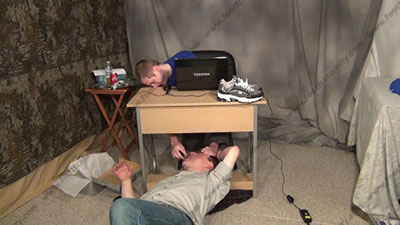 In slacks, sweaty designer crew gray and blue socks, Riley is sitting at his desk with his slave beneath his feet at the desk ready to be totally embarrassed & humiliated as he uses the sissy’s credit card to shop on line while Riley’s feet are being worshiped; he shows how to humiliate foot slaves while his bitch is kissing the socked toes, smelling them, worshiping the straight stud's socked feet as he has fun spending; mocks; & commands his slave who is at the straight feet; first sock action, then licking sweaty bare toes and between them; three camera views (one close up) & two other very sensual angles. Hot erotic sock & bare foot action during this time as Riley's straight feet are served. His Powerful ways of teasing and using foot sissys. He loves controlling and humiliating foot slaves and will not stop.