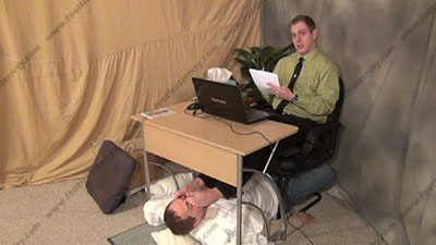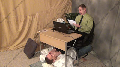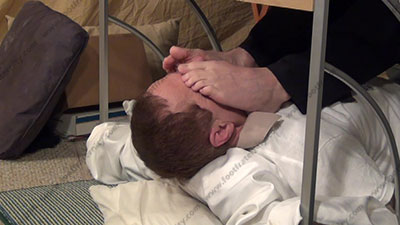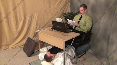 In shirt & tie, at the office, sweaty black sheer nylon socks, Riley is sitting at his desk with his slave beneath his feet at the desk ready to be totally embarrassed & humiliated as he is busy at work on the computer while his feet are being worshiped; he humiliates foot slaves while his bitch is kissing the socked toes, smelling them, worshiping the straight stud's socked feet as he does his office job from this power position; first sock action, then licking sweaty bare toes and between them; three camera views (one close up) & two other very sensual angles. Hot erotic sock & bare foot action during this time as Riley's straight feet are served. His Powerful ways of teasing and using foot sissys. He loves controlling and humiliating foot slaves and ignoring them as he is at his office.
