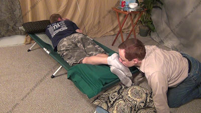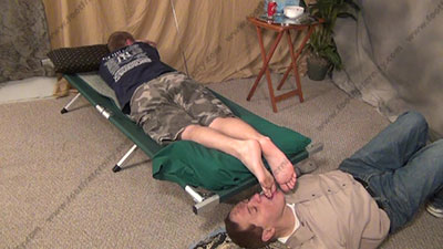 With slave at the feet of Riley who is in shorts, T-shirt and dirty white gym socks, while asleep on the cot, his bitch worships the feet of this Straight Stud as Riley sleeps the whole time of love making to his bare and socked feet while; three camera views (one close up) & two other very sensual angles. Hot erotic foot worship during the love making to his feet.