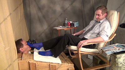 In loafers, sweaty royal blue sheer socks, Riley is sitting over his slave who is locked in the box with his feet shoved in the face, to be totally embarrassed & humiliated as he dominates, teases and mocks about his foot worship sessions and how to humiliate foot slaves. Then sissy has to kiss and sniff the dirty socked feet & toes, smelling them; worshiping the straight stud's socked feet as he talks; mocks & commands his slave who is pinned at the straight feet; three camera views (two close up) & one full length other very sensual angle. Hot erotic sock and bare foot action during this film as Riley's straight feet are served. His controlling ways of teasing foot sissys humiliates them and Riley wants it, and sissys need it.