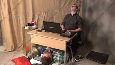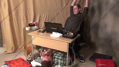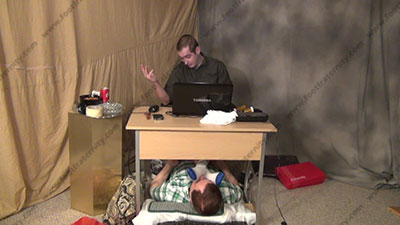 RILEY AT HIS DESK WITH FOOT SLAVE UNDERFOOT