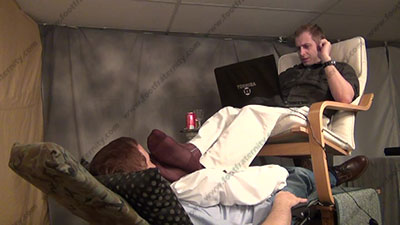 In loafers, sweaty sheer thick and thin socks, dress shirt, Riley decides to ignore his foot-licker’s petty troubles and sits over him for foot worship while he plays on his lap top. Slave must smell the socked feet, serve the bare feet and amuse Riley as he expects this service now and just treats the slave like dirt. Three camera views (one close up) & two other very sensual angles.