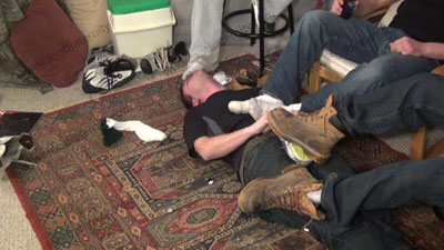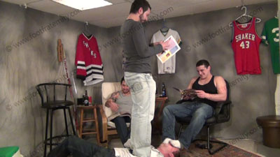 Three amazing Jocks from the Frat House (in their early 20’s) deal with a cop who comes to the house to deliver a thief young guy of their age who was caught going thru their gym lockers to steal their worn sports foot wear and more. The cop brings the young guy, Paul to the guys with the loot to see that it belongs to them. Deciding to let the Macho, Straight Jocks handle this handsome foot slave in their own ways works for all! Two of the Studs are in Timberland boots and one is wearing his gym sneakers, all with sweaty dirty white socks and smelly feet. Some in wife beaters and showing off their hot chests and bodies as they dominate and humiliate their new bitch foot slave in ways like: Foot worship; trampling; spit; verbal teasing and abuse; water sports; stomping; loogies; teasing; domination; humiliation; and more as they completely give this slave a work over at discovering his need for their sweaty boots, shoes, socks and feet! They totally embarrass him, laugh, and get loaded while making him their bitch! Then later they blackmail the cop & and the young guy to show that sports jocks feet rule. They realize that they have the power to take control to blackmail sissys into being their foot slave bitch. They have a spitting contest, ride the slave and do so many humiliation things that this scene lasts for over 4 hours making this film selection a TERROR TRILOGY. They kick Paul in the crotch with their boots on and off! They stomp him, force total humiliation through the entire scene while laughing their asses off! Burke & Addison are Hockey jocks and Graham is a Football Star, Wrestler and winning Weight Lifter! They know that Straight Guys Rule and make this most amazing scene a REALITY for all FIVE people in this film! They ash in his mouth; pose for photos doing this to the slaves; stand & trample, while forcing the slaves to be at the bottoms of their feet & to be a total boot/foot/sock slave with every kind of humiliation!. They love the power as they tease & torment. They have fun teasing & laughing at this hot young guy and pig slave with their booted, socked & bare feet action; then forcing him to do crotch sniffing comparison. Several sensational & very erotic views of this scene, each showing action that you miss from another angle. They are cocky, arrogant & find it really interesting to have complete sweaty boot in crotch; sock & barefoot worship, service & humiliation. VERY HOT & domination with much humiliation & young Straight Guys in Control! AMAZING – The hottest film you will ever see from the Foot Fraternity!