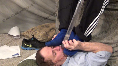 In work out pants, very sweaty and dirty Under Armor royal blue sweat socks, very arrogant, Nathan is teasing his slave who is laying on the ground beneath his feet to be totally embarrassed and humiliated as he dangles his sweaty feet in the sissy’s face, socked feet dangled in the sissy’s face and torments and teases and mocks his slave while he gives commands, orders and responds to his foot licker! Clips toe nails in slave’s mouth. Slave kisses and serves the socked feet, adoring them, smelling them, then bare foot worship and forcing slave to humiliate himself with foot worship of this very macho jock; He likes to show where his toes belong; three camera views (one close up) two other hot angles; Hot erotic foot action during this time as Nathan’s straight feet are served. He has slave create a dirty sock pillow made from his sweaty socks. His control at teasing ways of mocking foot sissys is real as he laughs at our desperate needs and humiliating images of foot sissys in love with his feet. He really likes this worship and teases the sissy for needing to worship his feet and be his foot bitch. This blonde jock rules with the power, teasing, mocking and having a kick doing this to his bitches!
