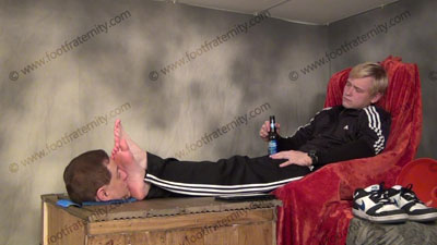 In workout clothes, very sweaty and dirty grey and black Under Armor sweat socks, very arrogant, Nathan is teasing his slave who is trapped in a box with only his head out of the top of the box for teasing, dominating and keeping his sissy at his feet. Sissy is forced to stay at his macho young socks and feet and is totally embarrassed and humiliated as next he shoves his sweaty bare feet in the sissy’s face and torments and teases and mocks his slave who can’t move from his feet, while he gives commands, orders and responds to his foot licker! Uses bong to force W/s drink. Slave kisses and serves the socked feet, adoring them, smelling them, then bare foot worship and forcing slave to humiliate himself with foot worship of this very macho jock; gets foot worship while looking at Playboy mags; He likes to show where his toes belong; three camera views (one close up) two other hot angles; Hot erotic foot action during this time as Nathan’s straight feet are served. His control at teasing ways of mocking foot sissys is real as he laughs at our desperate needs and humiliating images of foot sissys in love with his feet. He really likes this worship and teases the sissy for needing to worship his feet and be his foot bitch. This blonde jock rules with the power, teasing, mocking and ruling.