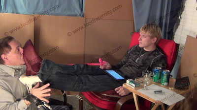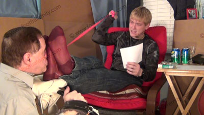 In jeans, loafers, very sweaty maroon thick and thin dress socks, very cocky and arrogant, Nathan is teasing his slave who is tied to his foot stool and trapped at his feet for teasing, dominating and more. He has him on a leash as he humiliates. Sissy is forced to serve his macho young socks and feet and is totally embarrassed and humiliated as next he shoves his sweaty socked feet in the sissy’s face and torments and teases and mocks his slave who can’t resist, while he gives commands, orders and responds to his foot-licker; Slave kisses and serves the socked feet, adoring them, smelling them, no bare foot action; He likes to show where his socked feet belong; three camera views (one close up) two other hot angles; Hot erotic foot action during this time as Nathan’s straight feet are served. His control at teasing ways of mocking foot sissys is real as he laughs at our desperate needs and humiliating images of foot sissys in love with his feet. He really likes this worship and teases the sissy for needing to worship his feet and be his foot bitch. This blonde jock rules with cocky domination.