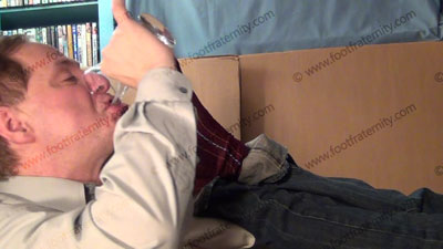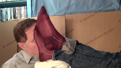 All the scenes from a hot close up view. The descriptions above describe the close up action. In jeans, loafers, very sweaty maroon thick and thin dress socks, very cocky and arrogant, Nathan is teasing his slave who is tied to his foot stool and trapped at his feet …