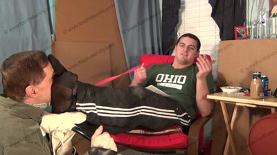 In work out pants, , very sweaty black thick and thin dress socks, very cocky and arrogant, Graham is teasing his slave who is tied to his foot stool and trapped at his feet for teasing, dominating and more. He has him on a leash as he humiliates. Sissy is forced to serve his macho Jock socks and feet and is totally embarrassed and humiliated as next he shoves his sweaty socked feet in the sissy’s face and torments and teases and mocks his slave who can’t resist, while he gives commands, orders and responds to his foot licker; Slave kisses and serves the socked feet, adoring them, smelling them, no bare foot action; He likes to show where his socked feet belong; three camera views (one close up) two other hot angles; Hot erotic foot action during this time as Graham’s straight feet are served. His control at teasing ways of mocking foot sissys is real as he laughs at our desperate needs and humiliating images of foot sissys in love with his feet. He really likes this worship and teases the sissy for needing to worship his feet and be his foot bitch. This football jock rules with cocky domination. No barefoot.