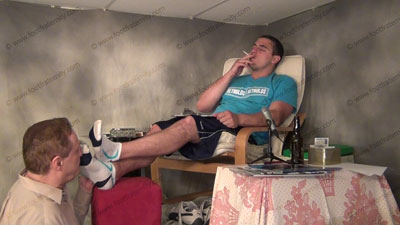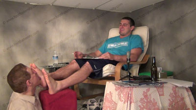 its WSOX Radio and Dr. Gridiron is on the air! In shorts, T-shirt and black and sweaty white shortie Nike athletic socks, Dr. Gridiron takes questions from his listeners while on the air and while having a slave at his socked feet. He gives his advice, and comments on the power that Macho Jocks have over foot slaves. He is laughing and sitting at the mike; his slave beneath his feet in the radio studio; while gives his advice for real on dominating the sissy foot slaves as he is “live” on the radio and mocks the slave using his super straight feet and laughing about it! Slave kisses and serves the feet, adoring them, smelling them and forcing slave to humiliate himself at his feet; Slave files the rough skin and sweat on the feet and licks it up. Then bare foot worship and service. The show is a huge success on how straight feet are to be served; three camera views (one close up) and two other very sensual angles; Hot erotic foot action during this time of his power – He loves to tease his foot slaves while on the Radio.