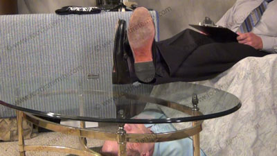 All the scenes from a hot close up view. The descriptions above describe the close up action. – Dr. Gridiron is given an award on the air! In slacks, shirt, tie and thin sheer dark dress socks and loafers …