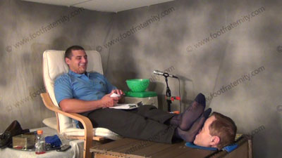 In sweaty thin dark cap toe dress socks, Dr. Graham has his slave locked in sweat box table with only his head available for the Dr. to relax and shove his socked feet in that face while he sets the rules for foot sissys. He gives his orders, and comments on the power that Macho Jocks have over foot slaves. He is amused and rubbing his feet in the face of his slave vulnerable face which is built into the coffee table; while he tells for real of his needs to serve jocks feet. Socked feet torment and action then barefoot service and worship in this scene as he mocks the slave using his straight feet and laughing about it! Slave kisses and serves the feet, adoring them, smelling them and is into humiliating himself at the Doctor’s feet; this is reinforcing on how straight feet and toes are to be served; three camera views (one close up) and two other very sensual angles. Hot erotic sock and bare foot action during this time of a visit with Dr. Graham who is taking advantage of this situation of his foot slaves.