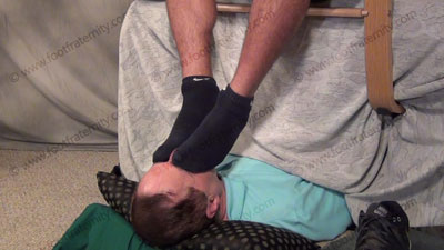 In shorts, T-shirt, very black work out Nike socks, macho Graham is teasing his slave who is laying on the ground beneath his feet to be totally embarrassed and humiliated as he dangles his sweaty socked feet in the sissy’s face, and torments and teases and mocks his slave while he tells true and false statements and takes in the worship with some orders and responds to his foot licker! Slave kisses and serves the socked feet, adoring them, smelling them to humiliate himself with foot worship of this very macho jock; then barefoot worship and action; He likes to show where his toes belong; three camera views (one close up) two other hot angles; Hot erotic foot action during this time as Graham’s straight feet are served. His control at teasing ways of mocking foot sissys is real as he laughs at our desperate needs and humiliating images of foot sissys in love with his bare feet. He really commands this worship and teases the sissy for needing to serve his feet and be his foot bitch. This football jock rules.