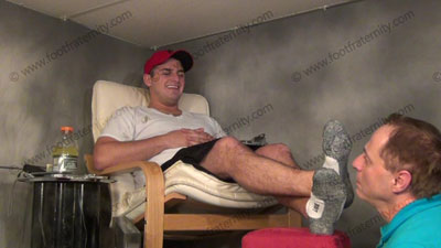In shorts, T-shirt, baseball cap, white sweaty and grey work out socks, macho Graham is teasing his slave who is kneeling at his feet to be totally embarrassed and humiliated as he shoves his sweaty socked feet in the sissy’s face, and torments and teases and mocks his slave while he tells all the secrets about foot slaves; he takes in the worship with some orders and responds to his foot licker! Slave kisses and serves the socked feet, adoring them, smelling them to humiliate himself with foot worship of this very macho jock; then barefoot worship and action; He likes to show where his toes belong; three camera views (one close up) two other hot angles; Hot erotic foot action during this time as Graham’s straight feet are served. His control at teasing ways of mocking foot sissys is real as he laughs at our desperate needs and humiliating images of foot sissys in love with his bare feet. He really commands this worship and teases the sissy for needing to serve his feet and be his foot bitch.