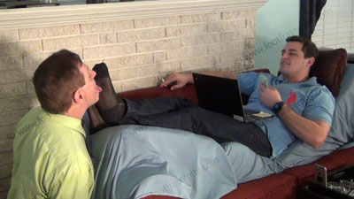 In black slacks, pull over shirt, dark thick and thin dress socks, macho Graham tells the story of how it started that the CEO was drunk and admitted to loving his feet. You see the scene of him drunk and confessing. He decided at that point to take control of his CEO. First you found him kneeling at the sofa in the CEO’s office at Graham’s feet for the rules and serving his feet for all time or the whole staff will know the dirty little secret. The CEO is totally embarrassed and humiliated as Graham shoves his sweaty feet in the sissy’s face, and torments and teases and mocks his slave makes humiliation commands and takes in the worship with some orders and responds to his foot licker! Slave kisses and serves the socked feet, adoring them, smelling them to humiliate himself with foot worship of this very macho jock; no barefoot worship in this part; He likes to show the new control he has over his CEO who hired him; three camera views (one close up) two other hot angles; Hot erotic foot action during this time as Graham’s straight feet are served. His control at teasing ways of mocking foot sissys is real as he laughs at our desperate needs and humiliating images of foot sissys in love with his feet. He really commands this worship and teases the sissy for needing to serve his feet and be his foot sissy. This is a sock only scene to start here.