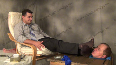Dressed up for game day, dress shirt shirt and his sweaty sheer socks from school all week, these three views are of this Macho athletic stud coach having his feet licked and socks sniffed & feet worshiped after work, while he teases and mocks his foot slave; spits in his face; while he is locked in a box with only his head exposed. He teases to his team about how to put us in our place to superior Str8 Jocks! He orders foot worship, torments slave; socked foot & bare foot adoration and mocking, teasing & humiliation the helpless foot slave. He loves foot worship, seeing the humiliation; socked foot & bare foot adoration and mocking & teasing the sissy foot slave then relaxes with slave locked in the box!