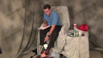 In black slacks, pull over shirt, think black dress socks, macho Graham is commanding as he is teasing his slave who is lying beneath the macho feet to be totally embarrassed & humiliated as he shoves his sweaty socked feet in the sissy’s face, & torments & teases and mocks his slave makes humiliation commands and takes in the worship with some orders and responds to his foot licker! Graham is sitting in an easy chair with his feet in slave’s face for worship. He puts his cigarette out on the slave’s hand! Slave must thank him for this ultimate humiliation. Slave kisses & serves the socked feet, adoring them, smelling them to humiliate himself with bare foot worship of this very macho jock; He likes to show where his toes belong; three camera views (one close up) two other hot angles; Hot erotic foot action during this time as Graham’s straight feet are served. His control at teasing ways of mocking foot sissys is real as he laughs at our desperate needs and humiliating images of foot sissys in love with his feet. He really commands this worship and teases the sissy for needing to serve his feet and be his bitch. Total humiliation and domination.