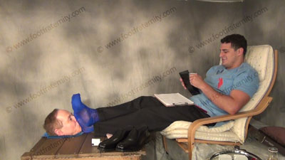Wearing slacks, pull over shirt and his sweaty royal blue thick & thin sheer socks from work all week, these three views are of this Macho athletic stud having his feet licked and socks sniffed & feet worshiped after work, while he teases and mocks his foot slave who is locked in a box with only his head exposed. He commands foot worship, torments slave; socked foot & bare foot adoration and mocking, teasing & humiliation the helpless foot slave. He loves foot worship, torments his slave; socked foot & bare foot adoration and mocking & teasing the sissy foot slave.