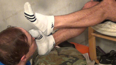 Wearing shorts and his sweaty socks from the gym all week, these views are from other cameras of close ups from his films 8675-8676-8677, of this Macho athletic stud having his cleats licked and socks sniffed & bare feet worshipped while he teases and mocks his foot slave. He commands foot worship, torments slave; socked foot & bare foot adoration and mocking & humiliation the helpless foot slave.