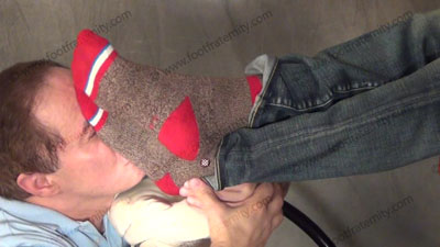 Dressed casually, various sox; Master Riley has his slave kneeling to serve his feet in these close up only scenes from the above films on a different angle. Really HOT to see it close up!
