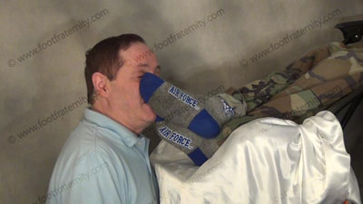 Dressed in a hoodie & camouflage pants & wearing various sox; Master Riley has his slave kneeling to serve his feet in these close up only scenes from the above films on a different angle. Extremely Exciting to see it so very close up!