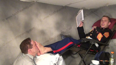 In his dress blues Marine Uniform & wearing his sweaty sheer socks, these three views are of this USMC Riley sitting in his gravity chair with his bitch kneeling at his feet while he is having his socks sniffed & worshiped, while he takes cash from the sissy for falling in love with his feet! Then bare foot worship & gifts given to the Marine! Head used as a foot stool! He teases and mocks his foot slave who is kneeling on the floor before Riley, while worshiping his socked feet. Conceited Riley talks about his narcissistic self & how perfect he is to all slaves & they love to worship his feet! He loves this foot worship, seeing the humiliation; socked foot adoration while making the sissies pay for it. Another very HOT Marine scene!