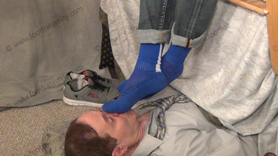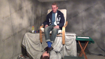 In jeans, nice shirt & his sweaty blue Under Armor socks, these three views are of Riley sitting above his foot bitch who is on the floor at his feet while he is having his feet licked, socks sniffed & worshiped, as he gives attitude to the sissy for falling in love with his feet! He teases and mocks his foot slave who is lying on the floor before the jock, while worshiping his feet. Arrogant Riley talks about his slaves & what is expected & his perfect self & how great he is to all sissies because they love to worship his feet! He can’t get enough of this attention.