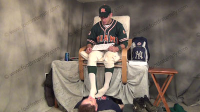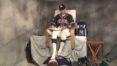 In full baseball uniform & his sweaty stirrups & white thin socks, these three views are of baseball Riley sitting above his foot bitch who is on the floor at his feet while he is having his cleats licked, socks sniffed & worshiped, while he gives attitude to the sissy for falling in love with his feet! He teases and mocks his foot slave who is lying on the floor before the baseball jock, while worshiping his cleats & socked feet. Conceited Riley talks about his perfect self & how great he is to all slaves because they love to worship his feet because he is a sports jock! He loves this worship, seeing the humiliation and adoration while making the sissies pay for it. Very demeaning & a show of straight athlete power!