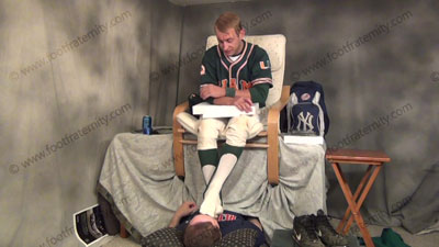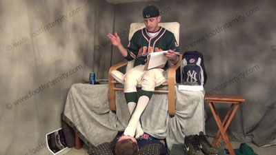 In full baseball uniform & his sweaty stirrups & white thin socks, these three views are of baseball Riley sitting above his foot bitch that is on the floor at his feet while he is having his socks sniffed & worshiped, while he gives attitude to the sissy for falling in love with his feet! He teases and mocks his foot slave who is lying on the floor before the baseball jock, while worshiping his cleats & socked feet. Then he relaxes & sits back while he is worshiped. Conceited Riley loves his perfect self & how great he is to all slaves because they love to worship his feet because he is a sports jock! He enjoys this worship, seeing the humiliation and adoration while making the sissies pay for it. A show of the power of a straight athlete!