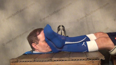 In sports uniform, blue Under Armor sweaty sox; Athletic Riley has his slave locked in the box exposing only the slave’s head. As he relaxes in an easy chair, Master teases, with his feet right in the face of the slave as he sits back, commands foot worship, teases, mocks & torments him; socked & bare foot adoration and mocking the helpless slave. He makes slave give him new shoes out of love for his feet. Three great views, one very close up one! Riley truly LOVES this control over his foot slaves!