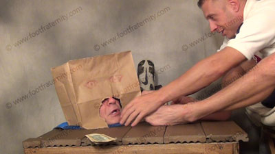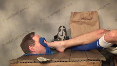 In sports uniform, blue Under Armor sweaty sox; Athletic Riley has his slave locked in the box exposing only the slave’s head. As he relaxes in an easy chair, Master teases, with his feet right in the face of the slave as he sits back, commands foot worship, teases, mocks & torments him; socked & bare foot adoration and mocking the helpless slave. Puts a bag over slave’s head with a hole for his toes! Riley demands this power rush & slaves must obey. Three great views, one very close up one! Riley controls his foot slaves locked at his feet. He loves to mock & tease the sissy in this lock box!