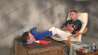 In Baseball uniform, blue Under Armor sweaty sox; Athletic Riley has his slave locked in the box exposing only the slave’s head. As he relaxes in an easy chair, Master teases, with his feet in the face of the slave as he sits back, commands socked foot worship, teases, mocks & torments him; cleaning, licking & kissing his baseball socks, then adoration & worship while mocking the helpless sissy. Arrogant Riley loves his perfect self & how great he is to all slaves because they love to worship his feet because he is a sports jock! He thrives on this worship, seeing the humiliation & adoration while making the sissies humiliated. A show of the power of a straight athlete! Three great views, one very close up one!