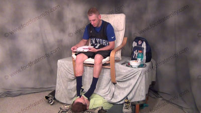 In full basketball uniform & his sweaty socks, these three views are of basketball Riley sitting above his foot bitch who is on the floor at his feet while he is having his socks sniffed & worshiped then bare feet licked, kissed & served, while he gives attitude to the sissy for falling in love with his feet! He teases and mocks his foot slave who is lying on the floor before the basketball jock, while worshiping his socked & bare feet. Conceited Riley talks about his perfect self & how great he is to all slaves because they love to worship his feet because he is a sports jock! Clips toe nails in slave’s mouth. He loves this worship, seeing the humiliation and adoration while making the sissies pay for it. Very demeaning & a show of straight athlete power!