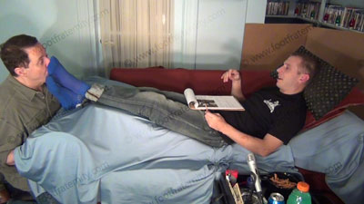 These three views are of Coach Riley - In jeans, sports shirt & blue Under Armor socks in the sissy’s face for worship as he is lounging on his sofa with his foot bitch who is kneeling at his feet; while Riley is on the air, having socked & bare feet sniffed, licked, kissed & worshiped. The Coach answers on how to get slaves to worship str8 guy’s feet! He teases and mocks his foot slave who is underfoot & worshiping his feet during a live radio interview! Coach talks about his perfect self & how great he is to all slaves because they love to worship his feet because he can actually condition us to need this humiliation. He loves this worship, seeing the domination and adoration while making the sissies pay for these sessions. Very demeaning & intense – he teaches his audience how to treat foot slaves while his perfect feet are in the sissy’s face the whole time!