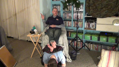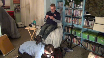In jeans, sports shirt & loafers and sheer socks in the sissy’s face for worship as he is sitting over his slave at the station & after the interview, he uses his slave as a foot stool as he plays video games!