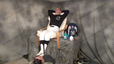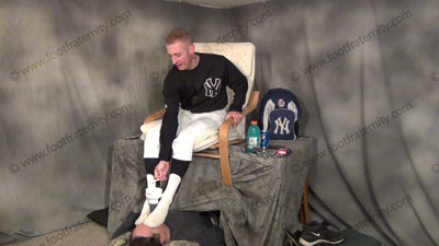 He is on the table above his sissy slave who must clean his cleats & worship his dirty baseball socks & stirrups. These three views are of Jock Riley - In full uniform with feet in the sissy’s face for worship as he is sitting over his slave, having socked Jock feet sniffed, licked, kissed & worshiped, he tells how it feels & how to get slaves to fall in love with his feet while his slave is on the floor beneath his feet! He teases and mocks his foot slave who is strapped underfoot by the stirrup & worshiping his feet after a game! He talks about his perfect self & how great he is to all slaves because they love to worship his feet because he can actually see us get excited when underfoot! Did you ever get teased in gym class in high school? Well Riley did the teasing to foot slaves & now he is a famous player who makes wimps PAY to be his foot bitches! He loves this worship, & telling about the humiliation and adoration of making the sissies pay for this, while his perfect feet are in the sissy’s face being adored!