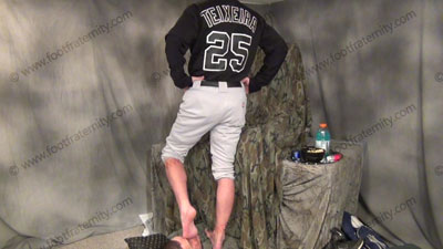 He is on the table above his sissy slave who must worship his dirty baseball socks & stirrups for a bit. Then he does much trampling & stepping on his sissy’s face & body. These three views are of Jock Riley - In uniform with feet in the sissy’s face for worship as he is sitting over his slave, stepping on his face while standing, having socked & bare Jock feet sniffed, licked, kissed & worshiped, he tells how it feels to get slaves to need his feet while his slave is on the floor beneath his feet! He teases and mocks his foot slave who is underfoot & worshiping his feet! He loves this bare foot & socked foot worship, & telling about the humiliation and adoration, while his macho feet are in the sissy’s face being adored! He is cocky & arrogant about this & loves to trample!