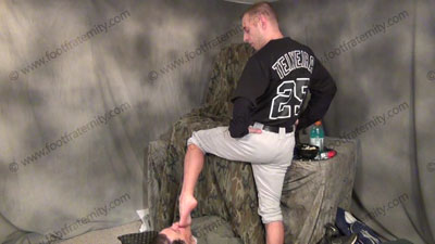 He is above his sissy slave who must worship his dirty baseball socks & stirrups. These three views are of Jock Riley - In uniform with feet in the sissy’s face for worship as he is sitting over his slave, trample & stepping on his face while standing, having socked & bare jock feet sniffed, licked, kissed & worshiped, he tells how it feels to get slaves to need his feet while his slave is on the floor beneath his feet! He teases and mocks his foot slave who is underfoot & worshiping his feet! He reads some fan mail & how great he is to all slaves because they love to worship his feet! He loves this & socked foot worship, & telling about the humiliation and adoration of making the sissies beg for this, while his macho feet are in the sissy’s face being adored! He is cocky & arrogant about this & loves this power rush & wiping his feet on us!