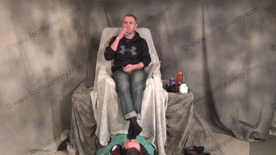 These three views are of Riley - In jeans, hoodie, black loafers & black thick & thin sheer socks in the sissy’s face for worship as he controls him to need to serve these socked & bare feet. He is sitting over his slave comfortably as his foot bitch who is humiliating himself on the floor at his feet; while Riley is having his socked & bare feet sniffed, licked, kissed & worshiped. This Jock reads the comments about his slave who fell in love with his feet. Then he really humiliates & dominates him by trampling him under his superior str8 feet! He teases and mocks his foot slave who is underfoot & worshiping his feet! He loves this adoration & seeing the humiliation while making the sissies submit to his perfect feet & beg for the privilege of being stepped on by Riley’s feet.
