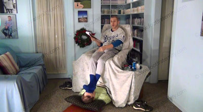 He is on the table above his sissy slave who must clean & worship his dirty blue baseball socks & stirrups then his bare feet. These three views are of Jock Riley - In uniform with feet in the sissy’s face for worship as he is sitting over his slave, having socked & bare jock feet sniffed, licked, kissed & worshiped, he tells how it feels to get slaves to need his feet while his slave is on the floor beneath his feet! He teases and mocks his foot slave who is underfoot & worshiping his feet! He talks about his perfect self & how great he is to all slaves because they love to worship his feet! He loves this bare foot & socked foot worship, & telling about the humiliation and adoration of making the sissies pay for this, while his perfect feet are in the sissy’s face being adored! He is cocky & arrogant about this.