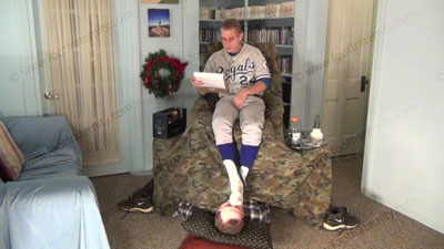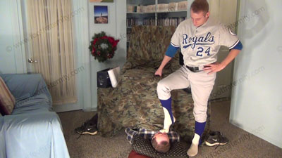 He is on the table above his sissy slave who must smell & worship his dirty white sweaty baseball socks & stirrups then his bare feet. These three views are of Jock Riley - In uniform with feet in the sissy’s face for worship as he is sitting over his slave, having socked & bare jock feet sniffed, licked, kissed & worshiped, he relaxes as this worship is administered! He teases and mocks his foot slave who is underfoot & worshiping his feet! Spits in slave’s mouth. He talks about his perfect self & how great he is to all slaves because they need to worship his feet! He stands up to wipe his feet all over the slave’s face. He loves this bare foot & socked foot worship, & telling about the humiliation and adoration of making the sissies beg for this, while his perfect feet are in the sissy’s face being adored! He expects this treatment constantly.