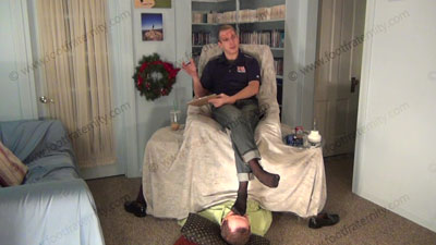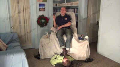 These three views are of Riley - In jeans, pull over shirt, back thin dress socks in the sissy’s face for worship as he controls him to need to serve socked feet. He is sitting over his slave comfortably as his foot bitch who is humiliating himself on the floor at his feet; while Riley is having his socked sniffed, licked, kissed & worshiped as he informs all of the laws (The 27th Amendment) of serving the feet of St8 guys. He really humiliates him! He teases and mocks his foot slave who is underfoot & worshiping his feet! Makes him confess his need for the Str8 feet. He loves this worship & seeing the humiliation while making the sissies submit to his perfect feet & beg for the privilege of being beneath his feet.
