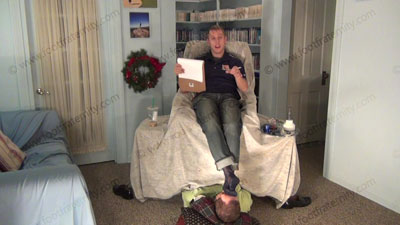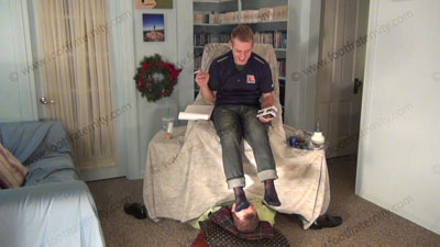 These three views are of Riley - In jeans, pull over shirt, back sheer cap toe dress socks in the sissy’s face for worship as he controls him to need to serve bare & socked feet. He is sitting over his slave comfortably as his foot bitch who is humiliating himself on the floor at his feet; while Riley is having his socked sniffed, licked, kissed & worshiped as he informs all of the laws (The 27th Amendment) of serving the feet of St8 guys. He really humiliates him! He teases and mocks his foot slave who is underfoot & worshiping his feet! Makes him confess his need for the Str8 feet. He loves this worship & seeing the humiliation while making the sissies submit to his perfect feet & beg for the privilege of being beneath his feet. Riley is wiping his feet on us with these new laws!