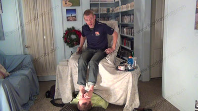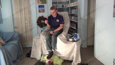 These three views are of Riley - In jeans, & sports shirt, sheer socks in the sissy’s face for worship as he controls him to need to serve these feet. He is lounging above the sissy comfortably as his foot bitch who is humiliating himself on the floor beneath his feet; while Riley is having his socked & bare feet sniffed, licked, kissed & worshiped. This Jock talks about slave’s worship to his feet & his other orders! He teases and mocks his foot slave who is underfoot & worshiping his feet! Then makes him lick his feet. Bare foot & sock worship in this film. He loves this adoration & seeing the humiliation while making the sissies submit to his perfect feet & any command or order must be obeyed.