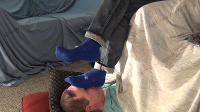 These three views are of Riley - In jeans, & hoodie, Under Armor royal blue socks in the sissy’s face for worship as he controls him to need to serve these feet. He is lounging above the sissy comfortably as his foot bitch who is humiliating himself on the floor beneath his feet; while Riley is having his socked feet sniffed, licked, kissed & worshiped. This Jock talks about slave’s service to his feet! He teases and mocks his foot slave who is underfoot & worshiping his feet! Sock worship in this film. He loves this adoration & seeing the humiliation while making the sissies submit to his perfect feet & pay for the honor while obeying him.