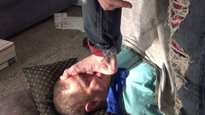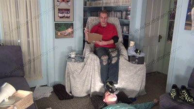 These three views (one close up) are of Riley - In torn jeans, & red shirt, sexy Under Armor work out socks & bare feet in the sissy’s face for worship as he controls him to need to serve these feet while sitting above him on the king’s chair. He is gives out teasing orders & laughs as the sissy obeys & makes love to his feet, humiliating himself by lying on the floor at his socked then bare feet; all while Riley is having his them sniffed, licked, kissed adored & worshiped. He teases, relaxes & watches the slave. His foot bitch is embarrassed to serve him like this; Riley is teasing & mocking him. He stands up & wipes his feet in slave’s face by stepping on it. He owns his foot slave who is at his feet & worshiping them. Foot massage is in order!